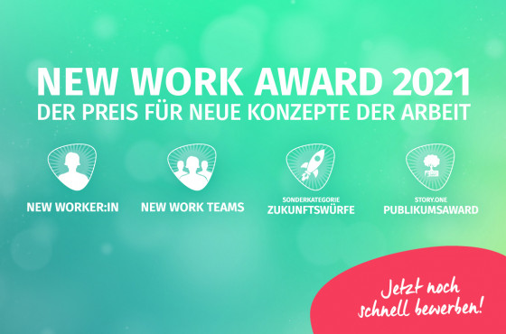 Die Bewerbungsphase für den NEW WORK Award geht in den Endspurt. Bis zum 10. August sind Bewerbungen in den Kategorien NEW WORKER:IN, NEW WORK TEAMS und ZUKUNFTSWÜRFE noch möglich. Neu ist der NEW WORK PUBLIKUMSAWARD in Kooperation mit der Plattform story.one, der die besten persönlichen New Work-Geschichten auszeichnet. Hier erfahrt Ihr, wie Ihr Euch einen der begehrten Preise sichern könnt.