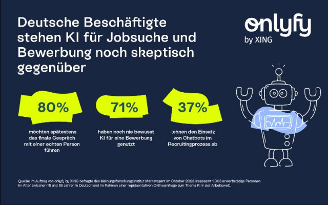 Die Mehrheit der Beschäftigten in Deutschland (71 Prozent) gibt an, noch nie bewusst Künstliche Intelligenz im Bewerbungsprozess benutzt zu haben. Auch, wenn es um die Akzeptanz von KI-basierten Chatbots im Recruitingprozess geht, sind Arbeitnehmerinnen und Arbeitnehmer zurückhaltend – knapp 40 Prozent der Beschäftigten stehen dem Einsatz offen gegenüber, 21 Prozent allerdings unter der Prämisse im weiteren Verlauf des Prozesses auch noch mit einer echten Person sprechen zu können. Rund 37 Prozent der Befragten lehnen KI-basierte Chatbots dagegen konsequent ab. Die Ergebnisse der Umfrage zum Thema „KI in der Arbeitswelt“ des Meinungsforschungsinstituts Marketagent im Auftrag der Recruitingspezialisten von onlyfy by XING zeigen, wie wichtig Bewerberinnen und Bewerbern nach wie vor der Kontakt zu echten Menschen ist.