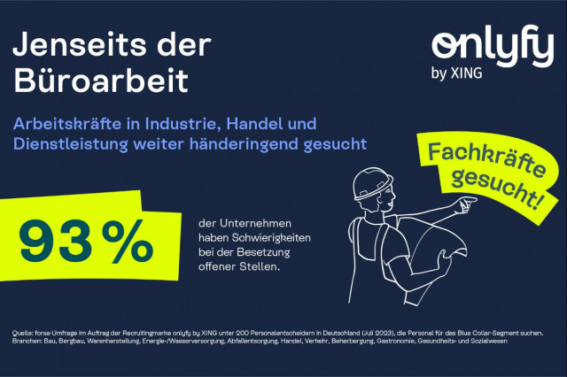 Fachkräfte still wanted: Drei Viertel der Unternehmen in Industrie, Handel und Dienstleistungen wollen in diesem Jahr trotz wirtschaftlichen Unsicherheit so viele Stellen besetzen wie in 2022. Das belegt eine Studie von onlyfy by XING, durchgeführt von forsa, zum Recruiting von Personal in körperlich fordernden Berufen.