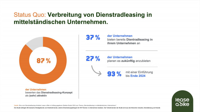 Dabei sind sich die befragten Unternehmen einig – Dienstradleasing als Corporate Benefit zahlt sich positiv aus: 84 Prozent der Studienteilnehmenden sind überzeugt, dass Dienstradleasing die Gesundheit ihrer Mitarbeitenden fördert und ihr Wohlbefinden am Arbeitsplatz verbessert. Darüber hinaus sehen 75 Prozent der Befragten in Dienstradleasing-Angeboten einen Weg zur stärkeren Bindung der Mitarbeitenden an das Unternehmen und damit einhergehend eine längere Betriebszugehörigkeit. Drei Viertel der mittelständischen Unternehmen sind zudem der Meinung, dass der Mitarbeiterbenefit den Recruitingprozess positiv beeinflusst. Ein attraktives Corporate-Benefits-Programm einschließlich Dienstradleasing kann potenzielle Bewerberinnen und Bewerber, insbesondere aus der Gen-Z, anlocken.