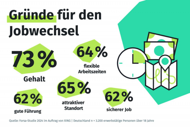 Entscheidend für Wechselwillige sind das Gehalt (73 Prozent), ein attraktiver Standort (65 Prozent), flexible Arbeitszeiten (64 Prozent) sowie ein langfristig sicherer Job und gutes Führungsverhalten (je 62 Prozent). Für diejenigen, die bleiben möchten, sind ein langfristig sicherer Job (75 Prozent), gutes Führungsverhalten (69 Prozent), flexible Arbeitszeiten (59 Prozent), ein sinnerfüllender Job (58 Prozent) und ein attraktiver Unternehmensstandort (57 Prozent) ausschlaggebend.