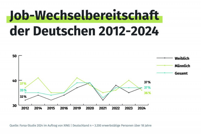 Die XING-Studie* zeigt, dass die Wechselbereitschaft unter deutschen Beschäftigten stabil auf einem hohen Niveau von 37 Prozent bleibt. Dieser Wert entspricht dem der beiden Vorjahre, nach einem Rückgang in den ersten Corona-Jahren. Thomas Kindler, Managing Director bei XING, kommentiert: "Die Zahlen zeigen, dass sich der Arbeitsmarkt zunehmend von der schwierigen wirtschaftlichen Lage entkoppelt hat." Der demografische Wandel, der Fachkräftemangel und ein solides Sozialsystem sorgten dafür, dass die Sorge vor dem Verlust des Arbeitsplatzes bei vielen Beschäftigten gering ist und die Wechselbereitschaft hoch bleibt.