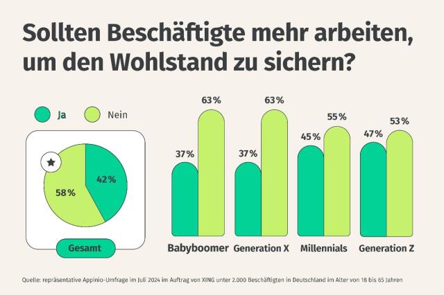 Trotz steigender Anforderungen durch unbesetzte Stellen und den demografischen Wandel sieht die Mehrheit der Beschäftigten (58 Prozent) keine Notwendigkeit, durch Mehrarbeit die Wirtschaft zu stabilisieren. Das ist ein zentrales Ergebnis des repräsentativen XING Arbeitsmarktreports 2024, den das Marktforschungsinstitut Appinio im Auftrag des Jobs-Netzwerks unter 2.000 Beschäftigten in der Deutschland durchgeführt hat. Die Skepsis gegenüber einem erhöhten Arbeitspensum ist besonders unter älteren Generationen wie den Babyboomern und der Generation X (jeweils 63 Prozent) verbreitet. Zwar erkennen jüngere Generationen wie die Millennials (55 %) und GenZ (53 %) die Notwendigkeit von Mehrarbeit theoretisch an, möchten jedoch selbst keine zusätzlichen Arbeitsstunden leisten.