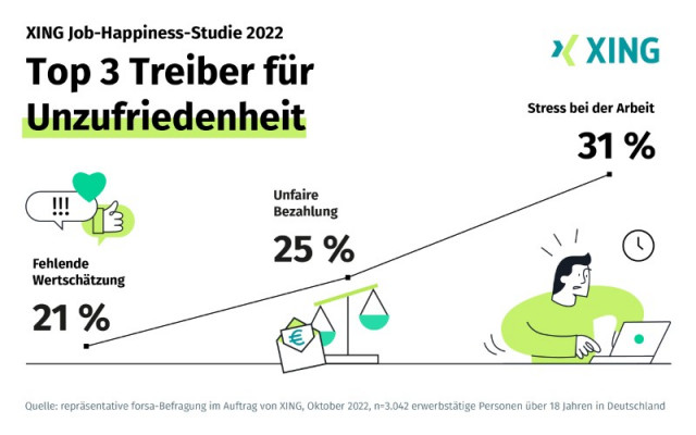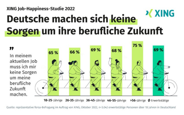 Das Kernergebnis der aktuellen XING Job-Happiness-Studie 2022: Mehr als zwei Drittel (69 %) der Befragten stimmen der Aussage zu: „In meinem aktuellen Job muss ich mir keine Sorgen um meine berufliche Zukunft machen“. Zwar gibt es keine Unterschiede zwischen den Geschlechtern (Zustimmung Frauen und Männer jeweils 69 %). Allerdings sind Beschäftigte der Babyboomer-Generation (über 56 Jahre) besonders zuversichtlich. Hier geben sogar 75 Prozent der Befragten an, sich keine Sorgen um die eigene berufliche Zukunft zu machen. Für die Studie befragte das Meinungsforschungsinstitut forsa im Auftrag von XING im Oktober diesen Jahres insgesamt 3.042 erwerbstätige Personen im Rahmen einer repräsentativen Online-Umfrage.
