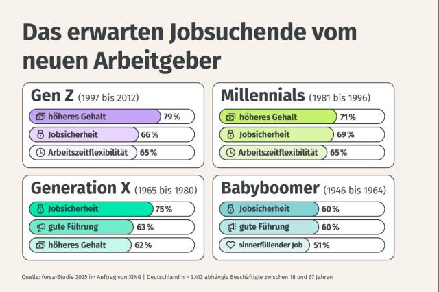 Trotz der Unterschiede eint die Generationen der Wunsch nach Stabilität: Jobsicherheit steht auf der Wunschliste potenzieller neuer Arbeitgeber bei allen Altersgruppen ganz oben. Für die Gen Z steht daneben finanzielle Sicherheit im Vordergrund – 79 Prozent wünschen sich ein höheres Gehalt. Auch flexible Arbeitszeiten und ein attraktiver Unternehmensstandort sind ihnen wichtig. Millennials legen zusätzlich Wert auf gutes Führungsverhalten. Bei der Generation X und den Babyboomern gewinnen immaterielle Werte wie Sinnerfüllung und wertschätzende Führung stärker an Bedeutung. "Jede Generation bringt eigene Erwartungen mit – wer alle erreichen will, muss differenzierte Angebote machen“, so Kindler.