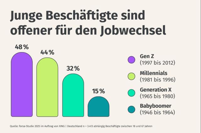 Am höchsten ist die Bereitschaft zum Wechsel bei der Generation Z. 48 Prozent der 18- bis 27-Jährigen sind offen für einen neuen Job oder haben diesen bereits konkret geplant. Auch unter den Millennials (28 bis 43 Jahre) ist die Quote mit 44 Prozent überdurchschnittlich. Die Generation X (44 bis 59 Jahre) zeigt sich zurückhaltender – hier liegt der Wert bei 32 Prozent. Bei den Babyboomern (ab 60 Jahren) sinkt die Wechselbereitschaft auf 15 Prozent. Dennoch ist bemerkenswert: Selbst in dieser Altersgruppe sind nur 11 Prozent dem ersten Arbeitgeber über die gesamte Laufbahn hinweg treu geblieben.