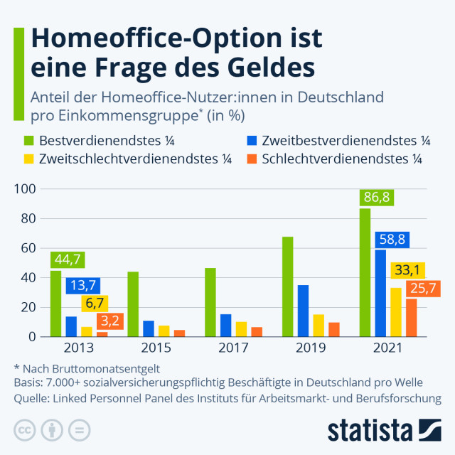Werden Homeoffice-Möglichkeiten vor allem von Besserverdienenden genutzt? Fakt ist: im Corona-Jahr 2021 haben nahezu 90 Prozent des bestverdienendsten Viertels der deutschen Erwerbstätigen mindestens zeitweise von den eigenen vier Wänden aus gearbeitet.
