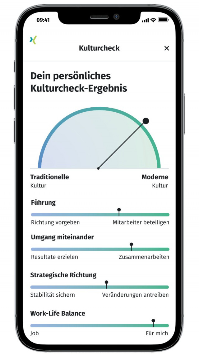 Der Kulturcheck auf XING basiert auf einem Daten- und Kulturmodell, das unter Federführung des Wirtschaftspsychologen Prof. Dr. Meynhardt von der HHL Leipzig Graduate School of Management für das New Work SE Tochterunternehmen kununu entwickelt wurde.  Die Fragen in den vier Kategorien „Führung“, „Umgang miteinander“, „Strategische Haltung“ und „Work Life Balance sind schnell und einfach zu beantworten, insgesamt werden dabei jeweils 20 Aspekte und Werte abgefragt. Abschließend gibt man die fünf Top-Präferenzen an, die einem persönlich im Job besonders wichtig sind. Das Ergebnis ist ein individueller Kulturkompass, der zeigt, worauf man in Zukunft bei der Wahl eines Arbeitgebers besonders achten sollte. Je größer die Übereinstimmung zwischen den individuellen Kultur-Wünschen und der Kultur des Unternehmens ist, desto größer ist die Wahrscheinlichkeit, dass Jobsuchender und Unternehmen dauerhaft zusammenpassen.