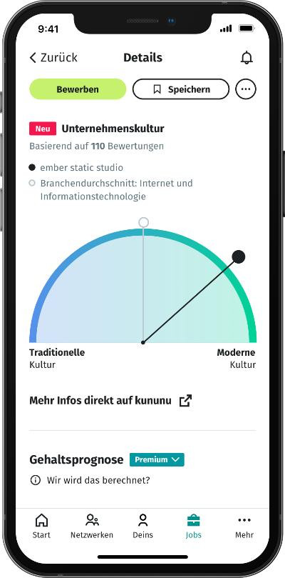 Eine weitere Umsetzung eines Wunsches von vielen Userinnen und Usern: Direkt im XING Stellenmarkt erhalten Job-Suchende durch die neu integrierten Kulturinformationen (rechts) jetzt noch vor einer Bewerbung wertvolle Informationen, ob die Kultur des Unternehmens, das nach neuen Talenten sucht, beispielsweise eher traditionell oder modern ist und können damit frühzeitig einschätzen, ob ihre persönlichen Wertvorstellungen mit jenen des Unternehmens übereinstimmen. Zum Launch der neuen XING App sind die Kulturinformationen zunächst für iOS verfügbar, in den nächsten Wochen folgt die Einführung für Android.