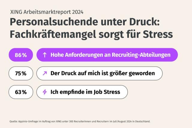 Trotz sinkender Zahlen bei offenen Stellen bleibt die Lage in Deutschlands Personalabteilungen angespannt. Der aktuelle XING Arbeitsmarktreport 2024, erstellt vom Marktforschungsinstitut Appinio, zeigt die erheblichen Herausforderungen für Recruiter. Laut der Umfrage, an der 300 Recruiter teilnahmen, haben 84 Prozent der Unternehmen zunehmend Schwierigkeiten, offene Positionen zu besetzen. Dieser Druck belastet auch die Recruiter: 75 Prozent berichten von steigendem Stress im Jahr 2023, während 63 Prozent über hohe emotionale Belastung klagen.