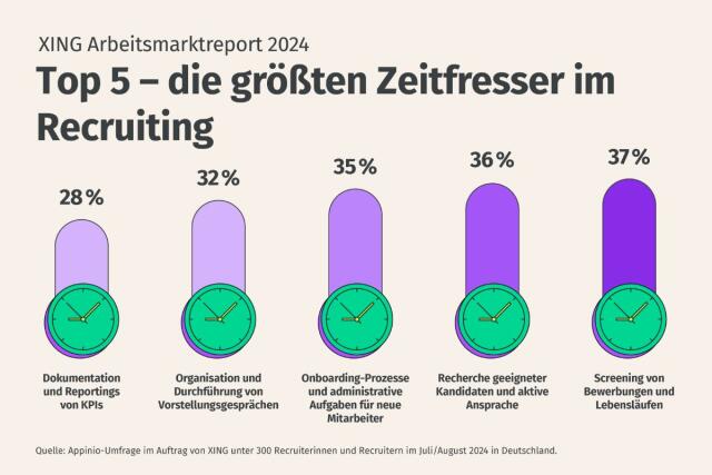 Ein wesentlicher Grund für die hohe Belastung der Recruiter ist der administrative Aufwand, der einen erheblichen Teil der Arbeitszeit beansprucht. 49 Prozent der Arbeitszeit fließt in die Sichtung von Bewerbungen und die Durchführung von Vorstellungsgesprächen, jedoch entfallen auch etwa 37 Prozent der Zeit auf das Screening von Lebensläufen und 36 Prozent auf die aktive Kandidatensuche. Onboarding-Prozesse und administrative Aufgaben für neue Mitarbeiter nehmen 35 Prozent der Zeit ein, während die Dokumentation und das Reporting von KPIs 28 Prozent beanspruchen.