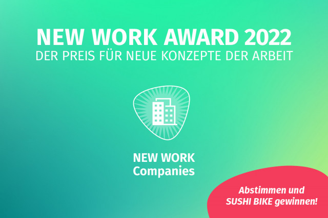 So, das war die Übersicht über die Kandidaten für die Kategorie NEW WORK Companies. Ein Klick auf das Banner unten führt zur Abstimmungsseite. Und wie gesagt: Voten kann sich lohnen. Unter allen Teilnehmern verlosen wir ein cooles E-Bike von SUSHI BIKE.