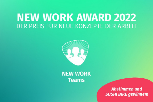 So, das war die Übersicht über die Kandidaten für die Kategorie NEW WORK Teams. Ein Klick auf das Banner hier unten führt direkt zur Abstimmungsseite. Und wie gesagt: Voten kann sich lohnen. Unter allen Teilnehmern verlosen wir ein cooles E-Bike von SUSHI BIKE.