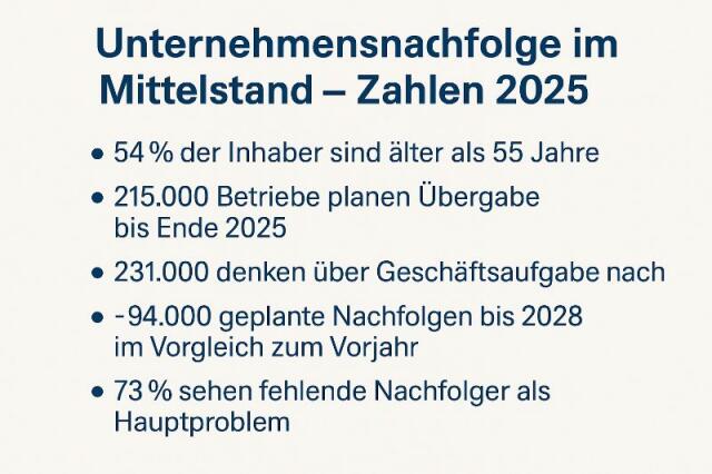 Der demografische Wandel trifft den deutschen Mittelstand zunehmend ins Mark: Laut einer Analyse der Kreditanstalt für Wiederaufbau (KfW) steht in den kommenden Jahren eine wachsende Zahl an Unternehmensnachfolgen an, aber gleichzeitig sinkt die Bereitschaft oder Möglichkeit zur Übernahme. Aktuell sind über die Hälfte der Inhaberinnen und Inhaber mittelständischer Unternehmen älter als 55 Jahre, das Durchschnittsalter liegt bei über 54 Jahren. Allein bis Ende 2025 planen rund 215.000 Betriebe eine Übergabe – ihre Eigentümer sind im Schnitt 65,4 Jahre alt. Gleichzeitig steigt die Zahl der Unternehmen, die mangels geeigneter Nachfolge in Erwägung ziehen, ganz aufzugeben: 231.000 Betriebe denken über eine Stilllegung nach, das ist ein neuer Höchststand.