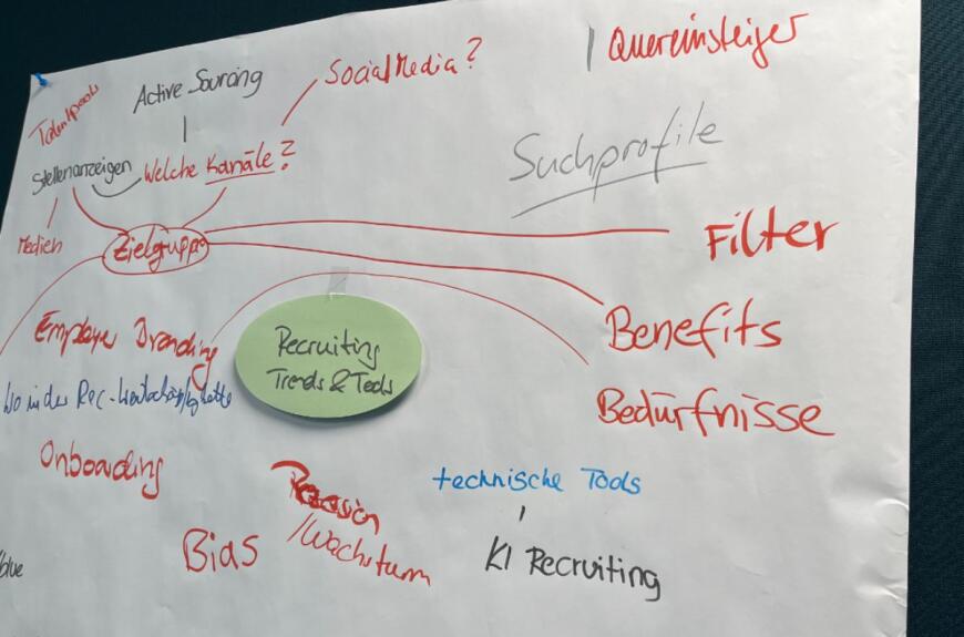 Im Mittelpunkt des Tages standen dann die interaktiven Roundtable-Sessions des Circles, die von der Hamburger Innovationsberaterin Barbara Blenski entwickelt und betreut wurden. In kleinen Gruppen diskutierten die Teilnehmenden aktuelle HR-Fragen, wie etwa die Optimierung von Recruiting-Prozessen, die Verbesserung der Candidate Experience oder das Erschließen ungenutzter Potenziale im Team. Mit kreativen Methoden wie Mindmapping oder Journey-Mapping entstanden praxisnahe Lösungen, die direkt auf die Bedürfnisse und Möglichkeiten des Mittelstands zugeschnitten sind.